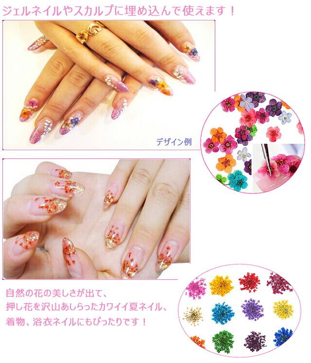 ・自然の花の美しさが出て、押し花を沢山あしらったカワイイ夏ネイル、着物、浴衣ネイルにもぴったりです!