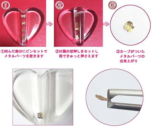 ・ハートの凹んだ部分にメタルパーツをのせ、上から押すとパーツにカーブがつきます。