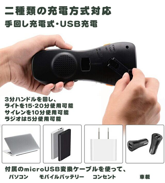 1.手回し充電式:3分ハンドルを回し、ライトを15-20分使用可能/サイレンを10分使用可能/ラジオは5分使用