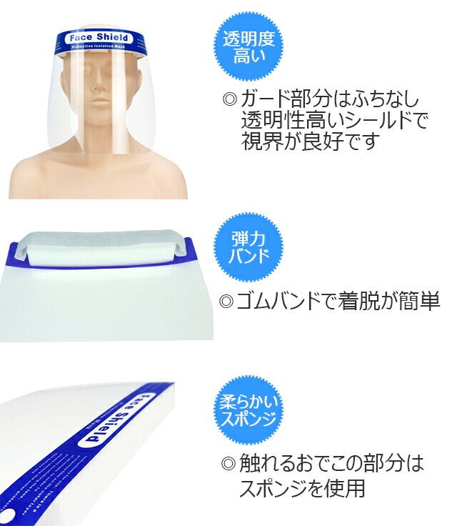 フェイスシールド 簡易式 フェイスガード キッチンフェイスシート 水洗い可 感染予防 ウィルス対策 クリア 目の保護 防塵 空気感染 防止 高透過率 軽量 保護 高品質 作業用 業務用 個人安全対策